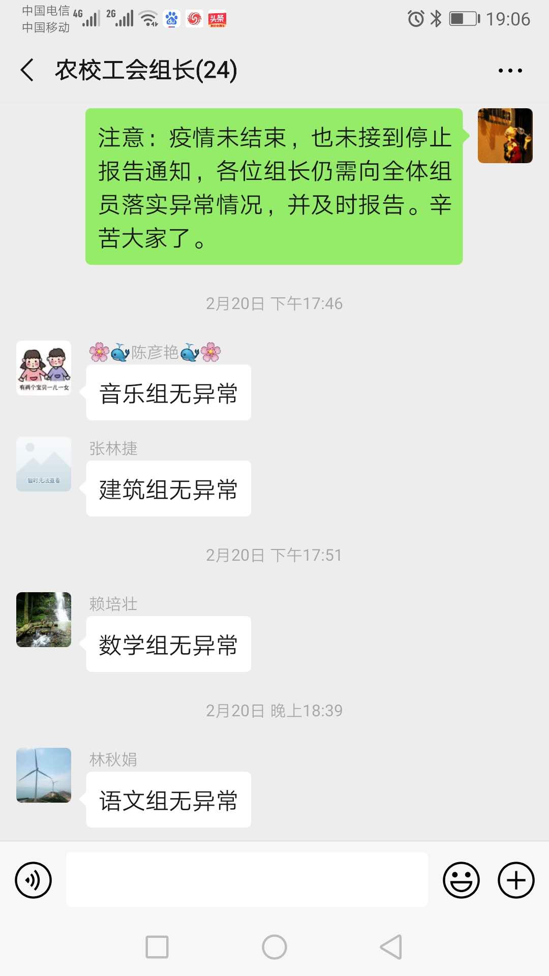 陈勇常务副主席临危不惧,及时制定方案,立即投身防疫战中。对于教职工的身体健康状况,特别是咳嗽、发烧等异常情况,他要求日报告、零报告制度,尤其对于身处湖北等重点疫区的教职工他更是逐一通过微信或电话予以异常情况落实和关心。并督促对从外地返回沙县的教职工做14天居家隔离观察的防控要求。他每天整理汇总各工会小组上报的会员落实情况,并报告给校医务室,统一填报相应报告表上报市教育局。在校工会的统筹下,各工会小组及全体教职员工认真对待,坚持如实及时的报告,加强自律,服从学校的防疫工作要求,主动自觉采取各种防控措施。