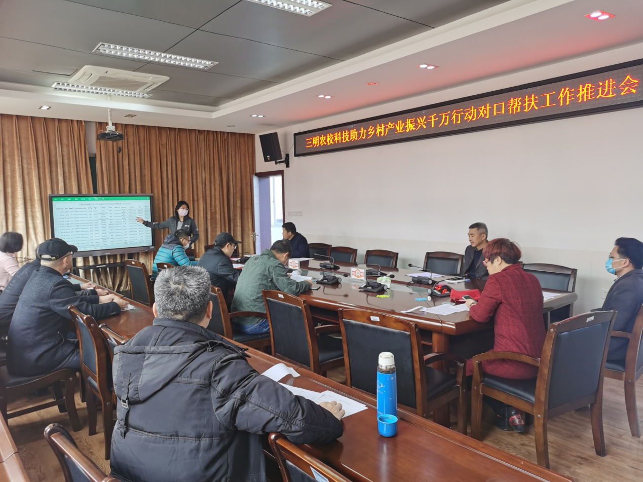 2019年8月起,三明农校共指派15名教师参与“三明市科技助力乡村产业振兴千万行动对口帮扶”工作。帮扶对象涉及大田、将乐、宁化、泰宁、明溪、梅列、三元共七个县(市、区)的其中15个建制村。在新的一年里,为持续落实此项工作,三明农校成教处于2020年3月20日组织相关教师召开了工作推进会,强调了服务任务和近期工作要点。随后,各位教师先后通过电话、微信等,与对接村的联系人(村主任)进行了沟通,了解春耕备耕情况,并确定下村现场指导的时间。
