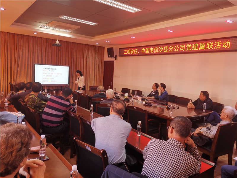 2019年以来,我校党委与中国电信沙县分公司党支部深入开展党建翼联共建共创,10月26日,正值我校举行九九重阳节退休老同志座谈会之际,中国电信沙县分公司党支部派邓敏馨同志到我校开展“金秋送爽 情暖重阳 健康中国 圆梦小康”党建翼联活动,为我校老年朋友和关爱老年健康的朋友分享了一堂生动的秋冬季心脑血管疾病专题养生科普知识课,大力倡导尊老、敬老、爱老、助老,传递和谐社会带来的祥和与温暖。课堂之余,邓敏馨同志还亲自使用华为脂肪称给关注健康的老年人逐个测体脂率,BMI指数、内脂等级等,让老年人体验智能家居产品。
