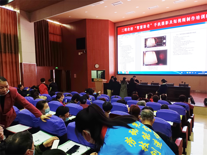 2022年3月4日上午,三明农校迎来了沙县区乐龄学堂的近百名老年人,在学校报告厅举办手机摄影及短视频制作培训班。